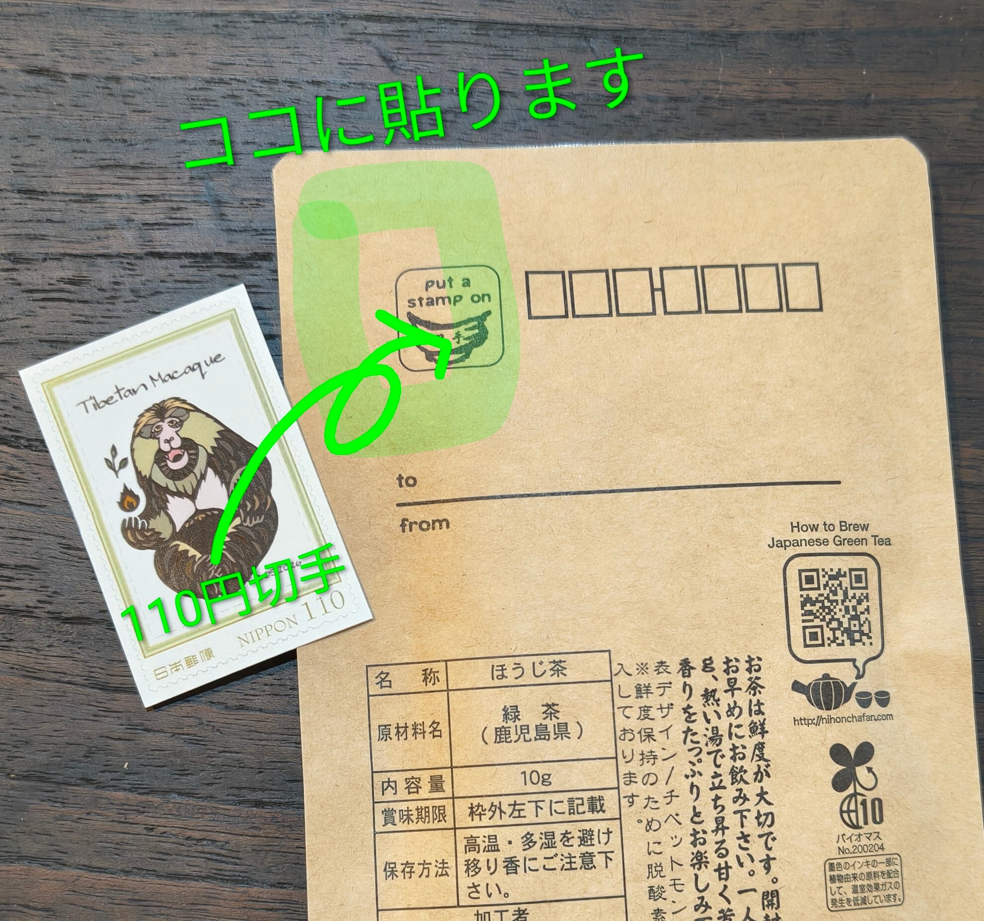 本物の110円切手なのでほうじ茶パッケージに貼ってそのまま誰かに送れます